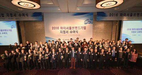△2016 하이서울브랜드기업 지정서 수여식에 참석한 참가자들이 기념촬영을 하고 있다.[제공:SBA]