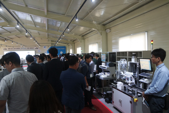 18일 경기도 안성 진코퍼레이션 사업장에 위치한 글로벌 스마트 팩토리 쇼룸 오픈식에서 참가자들이 스마트 팩트리존을 둘러보고 있다.